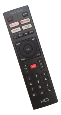 Controle remoto para TV da marca HQ Smart, com as teclas Youtube, Spotify, Prime Video e Netflix.