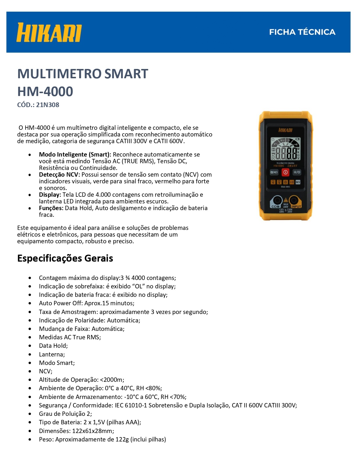 ACOMPANHA: Pontas de prova, pilhas, holster (capa de proteção) e manual em português.
